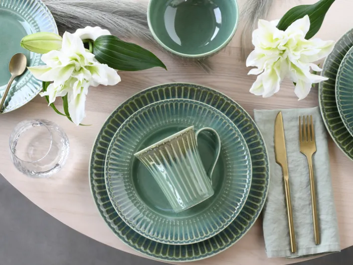 Der Kaffeebecher aus der Serie CELADON besticht durch seine grüne Hauptfarbe und eine gestreifte, senkrecht verlaufende Oberflächenstruktur. Das Steinzeug-Material sorgt für eine robuste Haptik und eine angenehme Stabilität. Mit einer Breite und Tiefe von jeweils 9,7 cm sowie einer Höhe von 10,5 cm bietet der Becher ein Fassungsvermögen von 330 ml. Die Oberfläche zeigt eine gleichmäßige Glasur mit sanften Farbverläufen und eine feine, reliefartige Musterung am oberen Rand. Das Produkt ist mikrowellengeeignet und damit vielseitig im Alltag einsetzbar. Der ergonomisch geformte Henkel erleichtert das Halten des Bechers, während das Gewicht von 0,32 kg eine solide Wertigkeit vermittelt. Geeignet ist der Becher insbesondere für den Einsatz in der Küche.