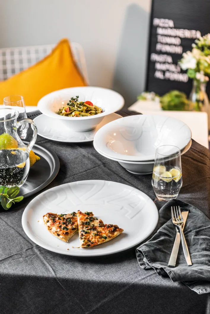 Das runde CreaTable Risottoteller GOURMET besteht aus hochwertigem Alltagsporzellan und lässt sich somit unkompliziert im Geschirrspüler reinigen. Mit dem top modernen Design mit breitem, nach innen abfallendem Rand, tiefem Nest und großem Risotto Themen-Relief ist der Teller ein wahrer Blickfang, während das schlichte weiß das Risotto perfekt zur Geltung bringt. Der Teller ist außerdem sehr robust und Reste lassen sich schnell und einfach in der Mikrowelle wieder aufwärmen.