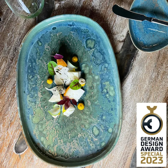 Die CreaTable Servierplatte YUKI mit 3 cm hohem Rand verdankt ihr außergewöhnliches Design einer Reaktivglasur. Diese erzeugt während des Brennvorgangs individuelle Farbverläufe und macht aus jeder Servierplatte ein Unikat. Die besondere Optik hat der YUKI-Serie den German Design Award 2023 eingebracht. Mit ihrem extravaganten Look setzt die Servierplatte Speisen perfekt in Szene und wertet den festlich gedeckten Tisch auf. Mikrowellengeeignet und spülmaschinenfest, macht sie jedoch auch im Alltag eine gute Figur.