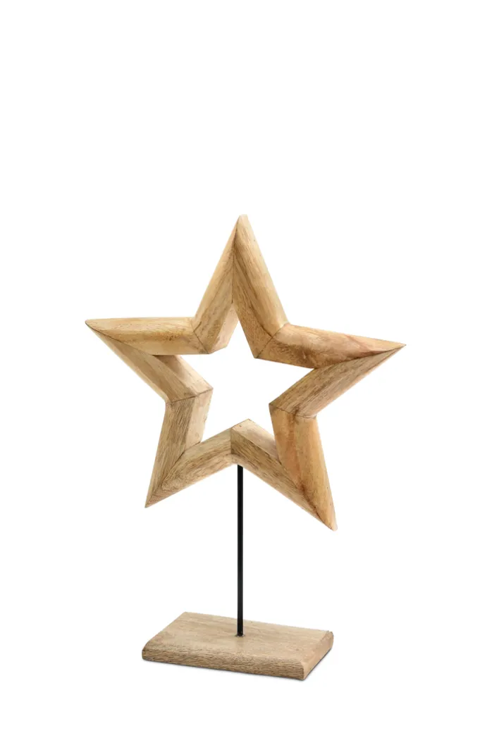 Dieses Deko Objekt der Serie BLACK FORREST besteht aus Mangoholz und ist mit einer klaren Sternform gestaltet. Die Oberfläche zeigt eine natürliche, braune Holzmaserung, die einen warmen und organischen Eindruck vermittelt. Das Objekt steht auf einem rechteckigen Holzsockel und wird durch eine schlichte Eisenstange getragen, welche die Verbindung zwischen Sockel und Stern herstellt. Die Maße betragen 42 cm in der Höhe, 30 cm in der Breite und 10 cm in der Tiefe. Das Design eignet sich besonders als dekorativer Akzent im Innenbereich und fügt sich durch die Kombination aus Holz und Metall in verschiedene Wohnstile ein.