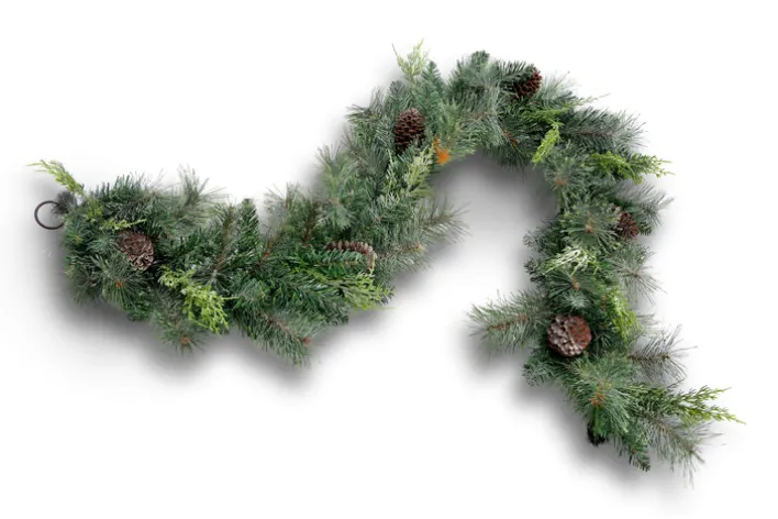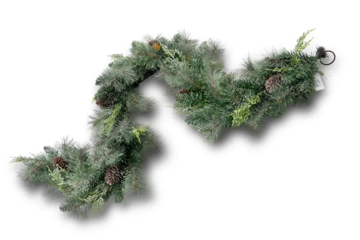 Die Hauptfarbe ist Grün, wobei braune Farbakzente durch die eingearbeiteten Zapfen sichtbar sind. Die Nadeln und Zweige der Girlande sind in unterschiedlichen Grüntönen gehalten und wirken durch die feine Strukturierung sehr naturgetreu. Die einzelnen Zweige sind unterschiedlich lang und dicht angeordnet, was der Girlande ein voluminöses und lebendiges Aussehen verleiht.
