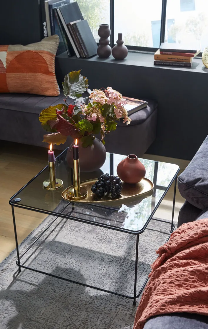 Dieses goldfarbige Dekotablett besteht aus Aluminium. Es misst 36 cm in der Breite und 40 cm in der Länge und ist einen Zentimeter hoch. Das Tablett ist annähernd rund und mit seiner unaufdringlichen und zugleich ausdrucksstarken Optik mit einer Vielzahl von Dekorationsstilen kombinierbar.