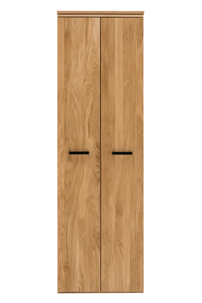 Der Garderobenschrank der Serie LIDO vereint Funktionalität und ansprechendes Design im Landhausstil. Mit einer Breite von 60 cm, einer Höhe von 195 cm und einer Tiefe von 39 cm bietet er ausreichend Stauraum für Ihre Garderobe. Der Schrank besteht aus massivem Eichenholz, das geölt ist, und verleiht Ihrem Raum eine natürliche und warme Ausstrahlung. Die zwei Drehtüren sind mit schwarzen Griffen ausgestattet, die einen eleganten Kontrast zum braunen Holzton bilden.