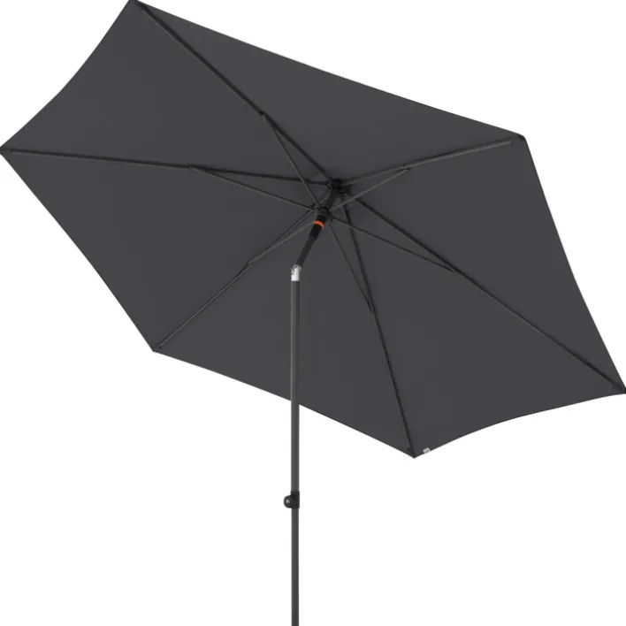 Der doppler Sonnenschirm myZONE hat einen Durchmesser von 300 cm und eine Höhe von 258 cm, die Durchgangshöhe beträgt 200 cm. Er ist aus Aluminium und Polyester in Anthrazit.