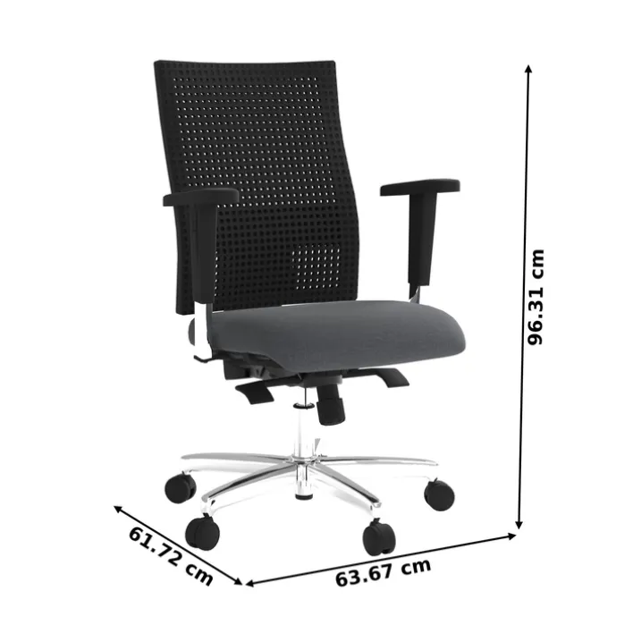 Mit einer Breite und Sitzbreite von 48 cm sowie einer Sitzhöhe von 41 cm bietet der Stuhl ausreichend Platz und Komfort. Die Höhenverstellbarkeit bis zu 53 cm und die Synchronmechanik ermöglichen eine individuelle Anpassung an die Bedürfnisse des Nutzers. Der Stuhl ist drehbar und verfügt über eine maximale Belastbarkeit von 110 kg. Das Gestell aus robustem Stahl und Kunststoff sorgt für Stabilität und Langlebigkeit.