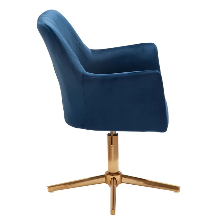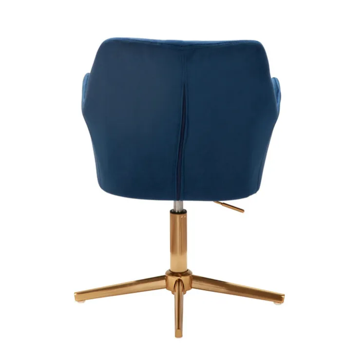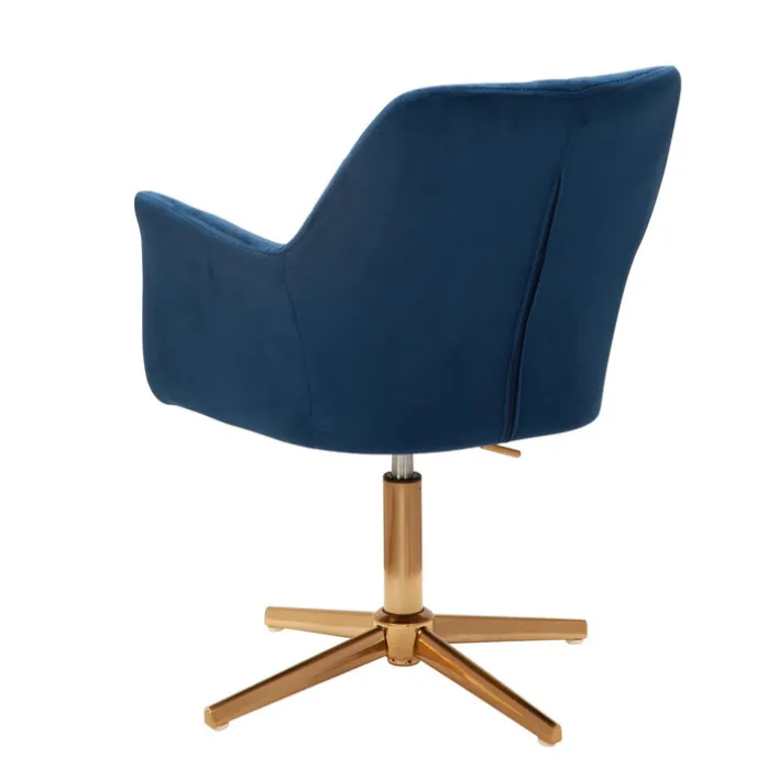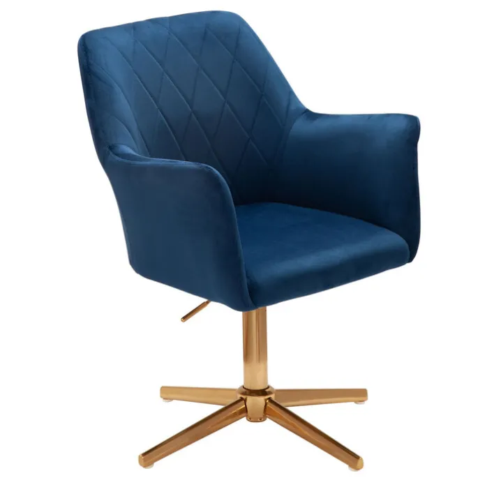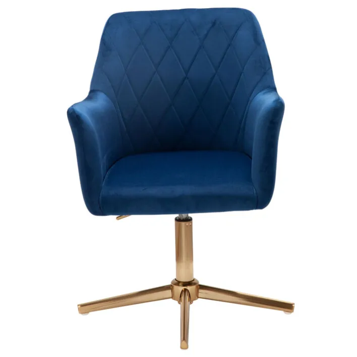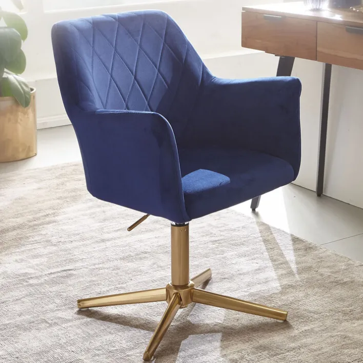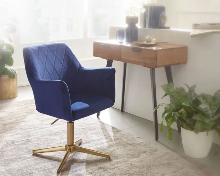In ein royales Blau getaucht und mit goldfarbigem Fuß wirkt dieser Drehstuhl höchst elegant. Die Rückenlehne besitzt ein reizvolles Rautenmuster, die Armlehnen und die Sitzfläche sind im Kontrast dazu glatt.