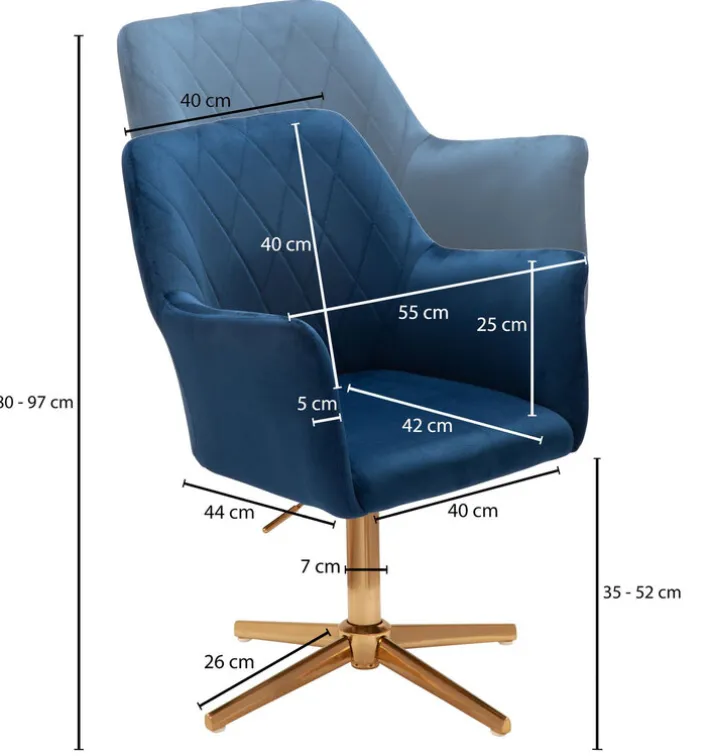 Breite: 55 cmTiefe/Ausladung: 55 cmGewicht: 11 kgmaximale Höhe von/bis: 80 – 97 cmSitzbreite: 40 cmSitztiefe: 42 cmSitzhöhe: 35 cmmaximale Belastbarkeit: 120 kgHöhe Rückenlehne: 40 cmHöhe Armlehne: 25 cm