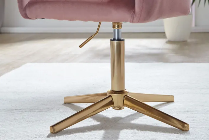 Der Drehstuhl hat eine Größe von 55 x 97 x 55 cm und ist mit maximal 120 kg belastbar. Er vereint das goldfarbig lackierte Stahlgestell mit Fußkreuz mit einem komfortablen Sitz. Dank rosa Samtbezug strahlt der Drehstuhl nicht nur Eleganz aus, er bietet zudem eine angenehme Haptik. Die Sitzhöhe des Stuhls ist von 35 cm auf 52 cm verstellbar, wodurch er sich perfekt an den Tisch anpassen lässt.