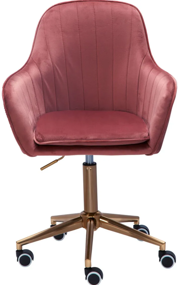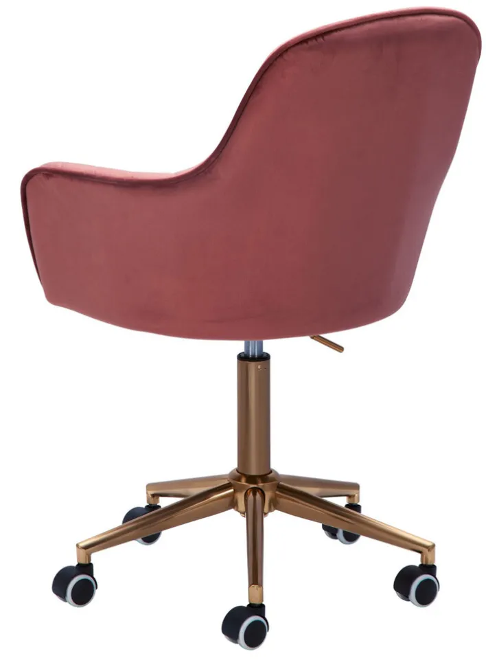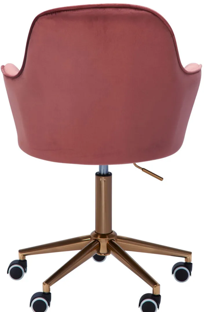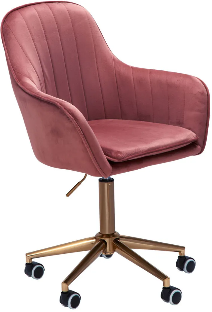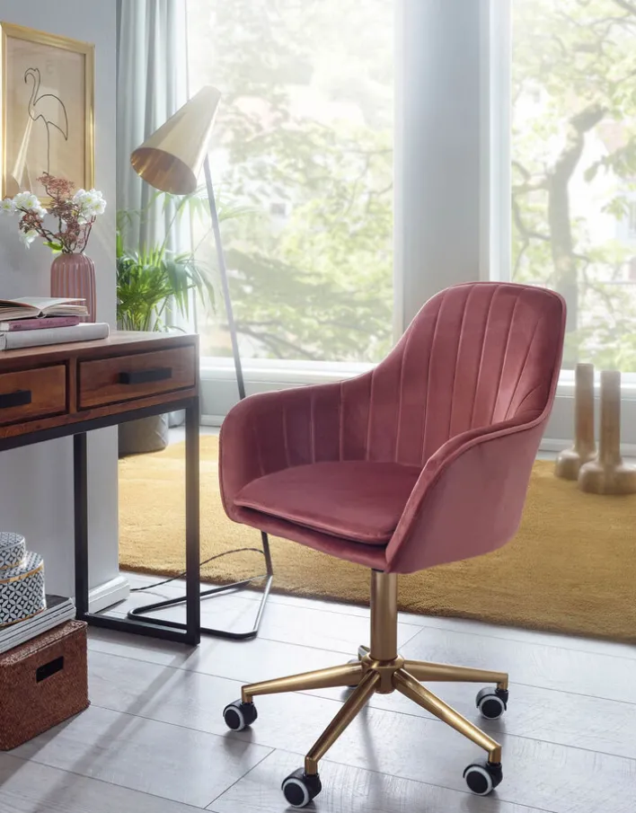 54 Zentimeter tief und 52 Zentimeter breit, mit einem 40 Zentimeter hohen Rückenteil und Armlehnen ausgestattet – an der rosafarbenen Sitzschale des Drehstuhls bleibt der Blick einfach hängen! Goldfarbig blitzt das Fußgestell mit seinen fünf Rollen und bringt Extravaganz ins heimische Arbeitszimmer. So macht Homeoffice richtig viel Spaß! Der Drehstuhl passt hervorragend in kleine Arbeitsecken und größere Arbeitszimmer, die im Vintage Stil oder Shabby Chic gehalten sind. Ein angenehmes Sitzpolster vervollständigt den Komfort.