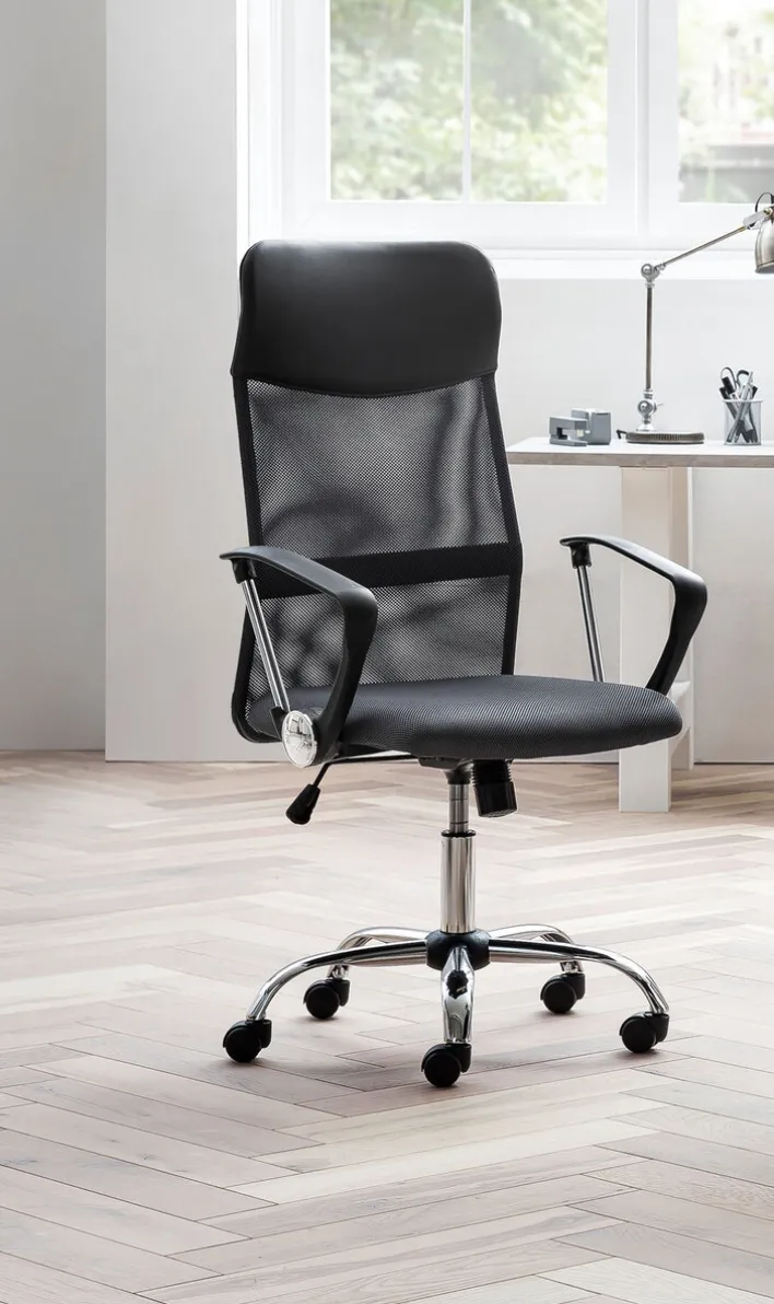 Der Drehstuhl mit Armlehnen kombiniert das chromfarbige Fußgestell aus Metall mit einem bequemen Sitz. Seine gepolsterte Rückenlehne mit Lordosenstütze ist zum Teil mit Netzstoff bespannt, der für eine gute Belüftung sorgt. Die Sitzhöhe des Schreibtischsessels lässt sich von 45 auf maximal 55 cm erhöhen und optimal an den Schreibtisch anpassen. Außerdem bietet der Drehstuhl eine Wippmechanik, womit Rücken und Bandscheiben an einem langen Arbeitstag entlastet werden.