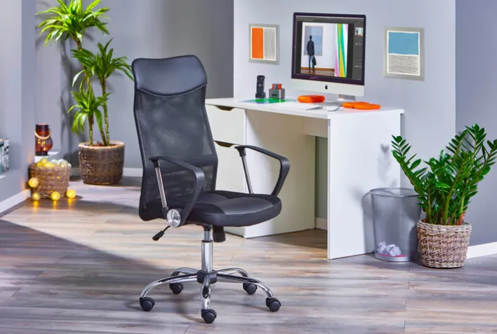 Dieser Schreibtischstuhl im modernen Design gefällt optisch dank seines Designs und des Kontrasts aus schwarzer Sitzfläche sowie verchromtem Metall-Fußkreuz. Er ist höhenverstellbar, sodass er eine Sitzfläche im Höhenbereich von 46 bis 55 cm bietet, die darüber hinaus drehbar ist. Der Stuhl verfügt außerdem über eine Wippmechanik, wodurch sich die Körperhaltung beim Sitzen verändern lässt. Er ist bis zu 100 kg belastbar und für einen höheren Komfort mit Armlehnen ausgestattet.