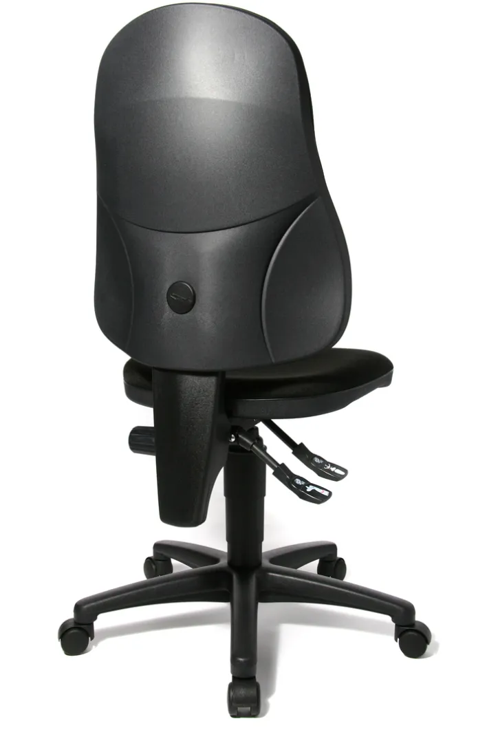 Der Drehstuhl ist in einem durchgehend schwarzen Farbton gehalten und besteht aus einem textilen Material. Die Sitzfläche sowie die Rückenlehne sind großzügig gepolstert und zeigen eine schlichte, glatte Struktur ohne sichtbare Muster. Die Rückenlehne ist ergonomisch geformt und bietet eine breite Auflagefläche, die nach oben hin leicht schmaler wird. Der Stuhl verfügt über ein schwarzes Kunststoff-Fußkreuz mit fünf Rollen, was eine flexible Beweglichkeit im Arbeitszimmer ermöglicht. Seitlich unter der Sitzfläche befinden sich zwei Hebel zur Einstellung von Sitzhöhe und Rückenlehne, was auf eine individuell anpassbare Funktionalität hindeutet. Das Design ist funktional und klar ausgerichtet auf den Einsatz im Arbeitsbereich. Als Produkt der Marke Topstar eignet sich dieser Drehstuhl besonders für den Gebrauch im Arbeitszimmer.
