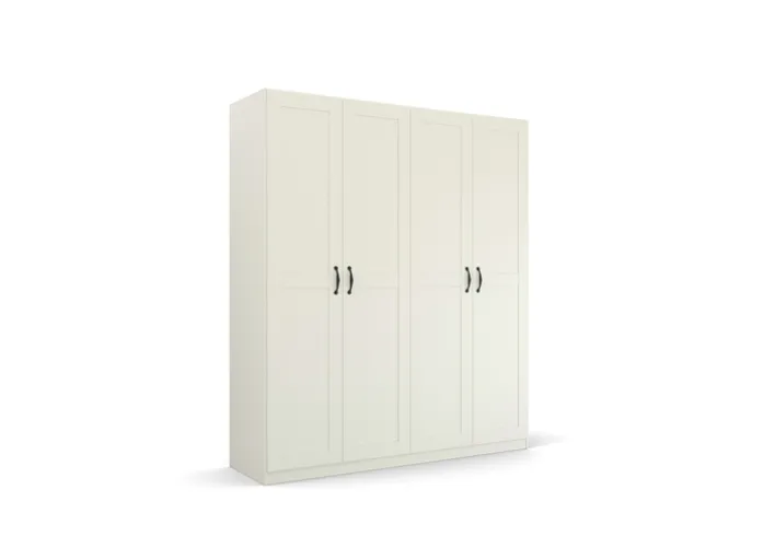 Der Drehtürenschrank aus der Serie CAMBRIDGE präsentiert sich im klassischen Landhausstil und ist in einem klaren Alpinweiß gehalten. Die vier Drehtüren verfügen über markante, dunkle Griffe, die einen dezenten Kontrast zur hellen Front bieten. Die Frontgestaltung ist durch eine ruhige, geradlinige Rahmenoptik geprägt, die dem Schrank eine zeitlose und gleichzeitig moderne Wirkung verleiht. Die Oberfläche des Schranks zeigt eine glatte, matte Struktur ohne sichtbare Maserung, was seinen schlichten Charakter unterstreicht.