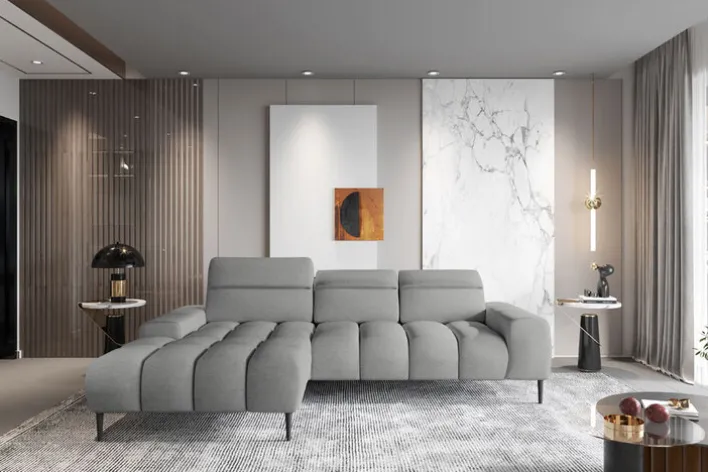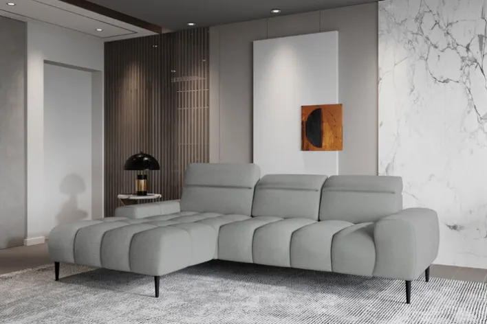 Das Sofa ist mit einer Nosagfederung und PUR-Schaum gepolstert, was für optimalen Sitzkomfort sorgt. Die manuelle und motorische Verstellung der Sitztiefe sowie die verstellbaren Kopfstützen bieten individuelle Anpassungsmöglichkeiten. Die Armlehnenhöhe beträgt 57 cm, während die Sitzhöhe bei 46 cm liegt, was eine bequeme Sitzposition ermöglicht. Mit einem Gewicht von 131,8 kg ist das Sofa robust und langlebig. Dieses Ecksofa ist die perfekte Wahl für alle, die Wert auf Komfort und modernes Design legen.
