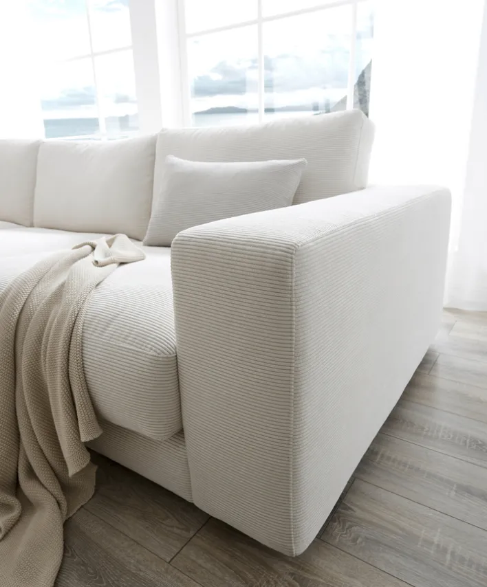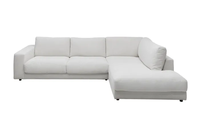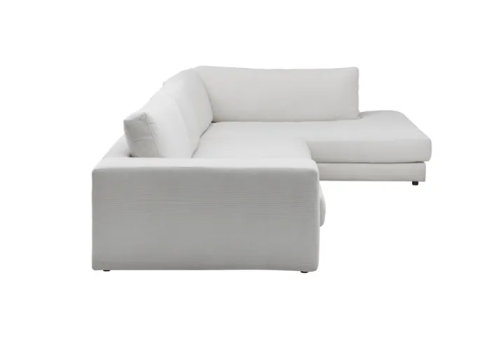 Das Ecksofa HIGH END mit dekorativem Cordbezug in Weiß lädt zu entspannten Stunden im Wohnzimmer ein. Die Polstergarnitur mit der rechts angebrachten Recamiere passt hervorragend zu einer modernen Wohnraumgestaltung.