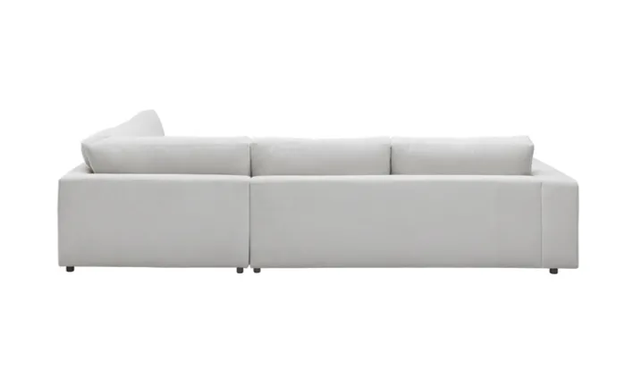 Seinen hohen Sitzkomfort verdankt das 325 x 224 x 86 cm große Ecksofa HIGH END weichen Polstern aus PUR Schaum mit Wellenunterfederung. Lose Rückenpolster und feste Armlehnen tragen zum Wohlfühlfaktor bei. Die Basis bildet ein stabiler Korpus aus Holznachbildung. Der Rücken ist echt bezogen, sodass sich das Sofa auch frei im Raum aufstellen lässt. Die schwarzen Standfüße bilden einen attraktiven Kontrast zum hellen Bezug und schonen dank ihrer Gleiter den Fußboden.
