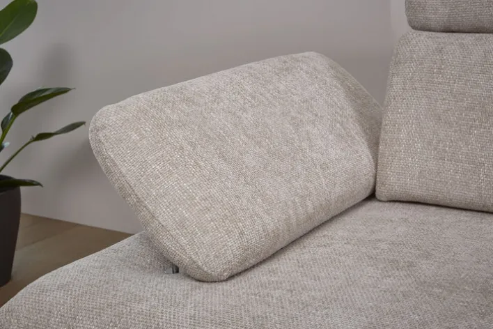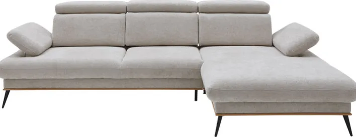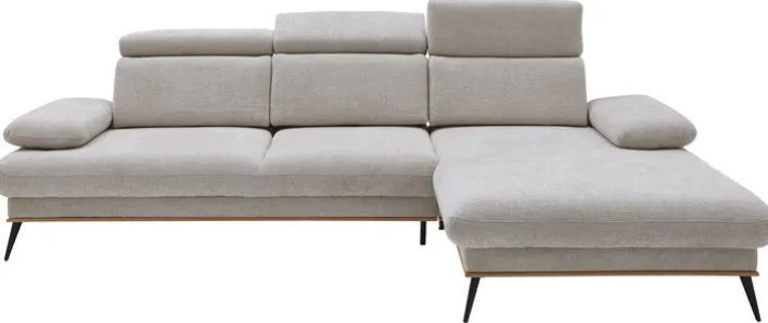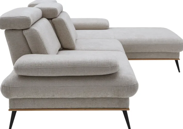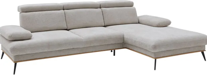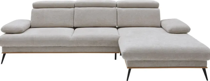 Das Ecksofa SANTORINI, ausgestattet mit den schwarzen Möbelfüßen aus Metall und einer Absetzungen aus massiver Eiche, passt zu vielen Einrichtungsstilen. Mit seiner attraktiven Farbgebung und dem Polyester-Bezugsstoff im Farbton Dove ist es ein Blickfang in jedem Wohnraum und lädt zu gemütlichen Stunden ein. Das Sofa besteht aus einem 2-Sitzer mit Armteil links und einem Longchair rechts. Sitztiefe, Armteil und Kopfteile sind bei Bedarf verstellbar. Die Schaumstoffpolsterung ist unterlegt mit einer bequemen Nosagfederung.