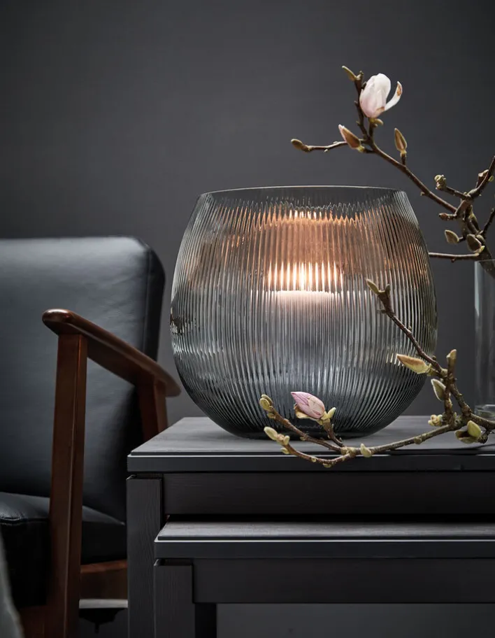 Das 26,5 cm hohe Windlicht EMMA erzeugt mit seiner bauchigen Form und der senkrecht geriffelten Struktur anmutige Lichteffekte. Das leicht transparente, graue Glas lässt sich ideal mit hohen oder niedrigen Stumpenkerzen kombinieren. Das Tanzen der Flamme über das dickwandige Glas zu beobachten führt zu Ruhe und Entspannung.