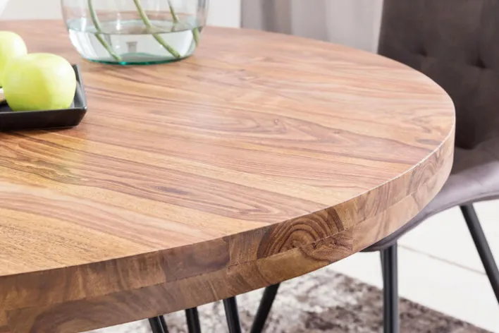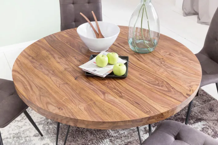 Der Esstisch kommt in der Farbe Braun und besteht aus Massivholz, genauer aus Rosenholz und Sheesham. Die Oberflächenbeschichtung der Tischplatte ist gebeizt, der Durchmesser beträgt 120 cm und die Höhe 78 cm.