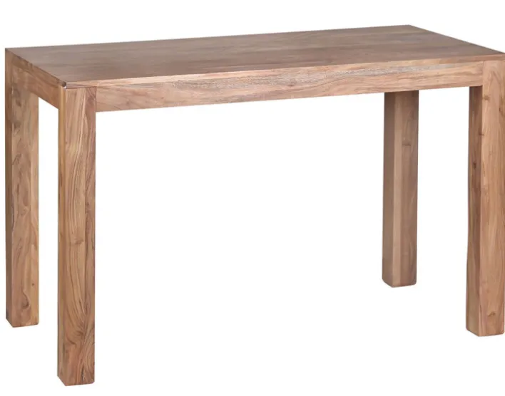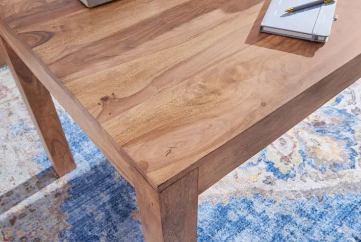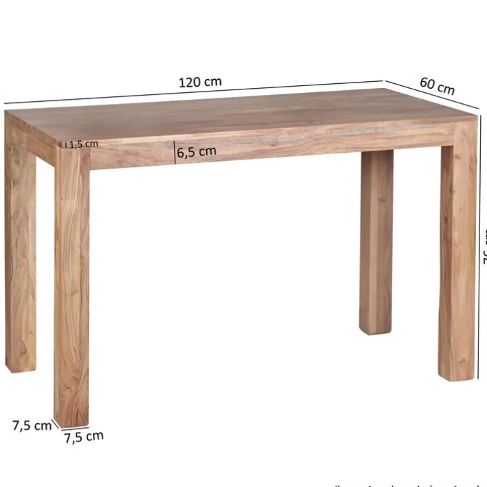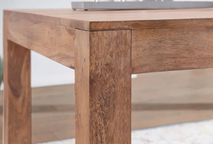 Der Esstisch misst in Länge und Breite 120 x 60 cm. Er besteht aus brauner, massiver Akazie. Zudem weist er ein Vierfußgestell auf. Seine Höhe beträgt 76 cm. Das Besondere daran: Es handelt sich um ein handgearbeitetes Möbel.