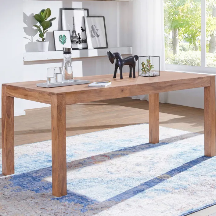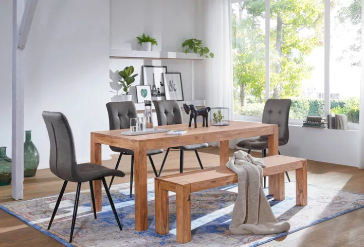 Schlicht und elegant präsentiert sich der rechteckige Esstisch aus reinem Holz. Sehr schön kommt in den Vierkantbeinen und der Tischplatte die lebhafte Maserung zur Geltung. Der Tisch kann Familie und Freunde zum Essen begrüßen, es kann an ihm auch gemalt und gebastelt werden. Er ist nur für Innenräume geeignet. Wer möchte, nutzt nur Tischsets, um die besondere Optik wirken zu lassen.