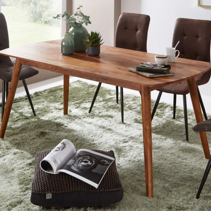 Der nahezu naturbelassene Esstisch aus Rosenholz misst 120 x 77 x 60 cm und kann auf seinen vier schräg gestellten Tischbeinen mit bis zu 50 Kilogramm belastet werden. Am schönsten präsentiert sich der Esstisch aus massivem Rosenholz ohne Tischdecke oder Tischbänder. Denn die besondere Maserung des nachhaltigen Rohstoffs kommt unter der Beize ohne weitere Imprägnierung besonders elegant zur Geltung. In Esszimmern oder Partykellern schaffen die vier kantigen Tischbeine aus der gleichen Holzart in schräger Aufstellung hohe Stabilität. Um die Langlebigkeit zu erhalten, sollte das rustikale Möbelstück keinesfalls in Feuchträumen sowie an Standorten ohne direkte Sonneneinstrahlung aufgestellt werden.