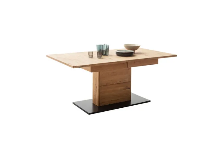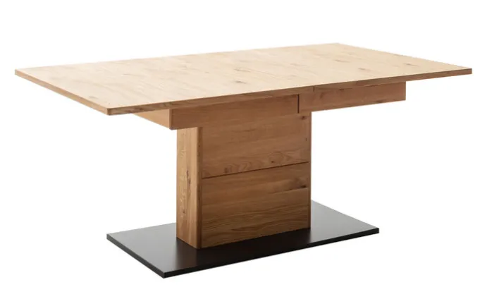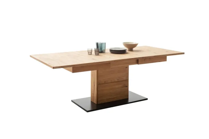 Esstisch AREZZO bietet mit einer Größe von 180 x 100 cm genug Platz für die ganze Familie, zumal er mithilfe einer Einlegeplatte kinderleicht auf insgesamt 230 cm verlängert werden kann. Die schöne Wildeiche Optik verleiht ihm eine moderne Ausstrahlung.