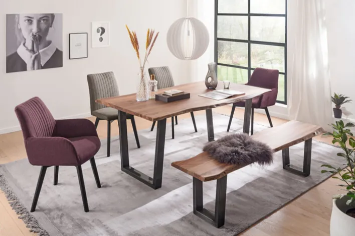 Der Esstisch CALABRIA hat eine Größe von 180 x 100 cm und ist ein massiv gearbeitetes Modell. Er eignet sich aufgrund seiner Maße insbesondere für großzügige Wohnlandschaften. Der Tisch zeigt sich mit klaren Kanten und kann als Esstisch in einem Esszimmer oder auch Wohnzimmer gestellt werden. Seine kufenförmigen Beine bieten umfangreichen Raum unter der Tischplatte, so dass die eigenen Beine auch mühelos ausgestreckt werden können.