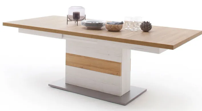 Der Esstisch der Serie CALVA vereint Funktionalität und modernes Design. Mit einer Breite von 100 cm, einer Höhe von 77 cm und einer Länge von 180 cm bietet er ausreichend Platz für gesellige Runden. Bei Bedarf lässt sich der Tisch auf eine maximale Länge von 280 cm erweitern, dank des praktischen Synchronauszugs. Die Hauptfarbe des Tisches ist Braun, ergänzt durch silberfarbene und weiße Akzente, die dem Tisch ein elegantes Erscheinungsbild verleihen. Der Farbton Pinie Aurelio harmoniert perfekt mit den weißen und aluminiumfarbenen Elementen.