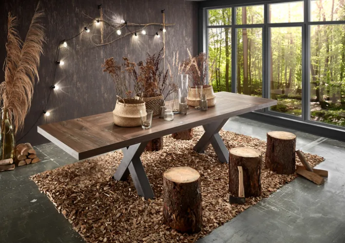 Das X-Gestell aus Metall in Schwarz sorgt für einen stabilen Stand und verleiht dem Tisch eine moderne Note. Die Kombination aus Holz und Metall schafft einen ansprechenden Kontrast, der sich harmonisch in verschiedene Einrichtungsstile einfügt. Dieser Esstisch ist nicht nur ein funktionales Möbelstück, sondern auch ein stilvolles Highlight für Ihr Esszimmer.