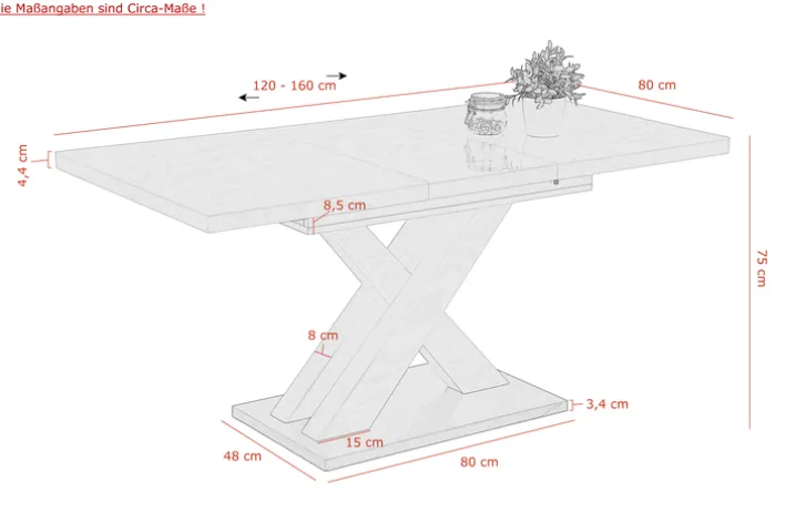Breite: 80 cmHöhe: 75 cmLänge: 120 cmTischlänge max. bei Auszug/Erweiterung: 160 cm