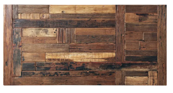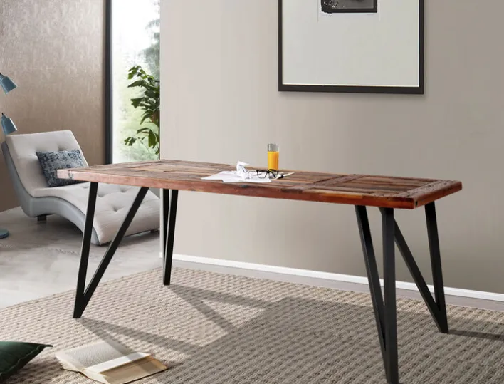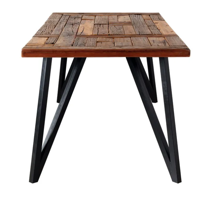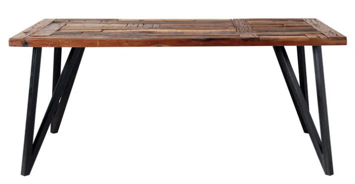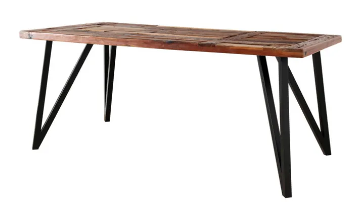Die stabile Tischplatte besteht aus Old Recycled Wood und ist geleimt. Die Oberflächen sind glatt geschliffen und lackiert. Die Tischplatte ist dadurch robust und strapazierfähig. Das Vierfußgestell des Esstischs ist aus Eisen hergestellt. Das geschweißte Metall ist mehrfach lackiert.