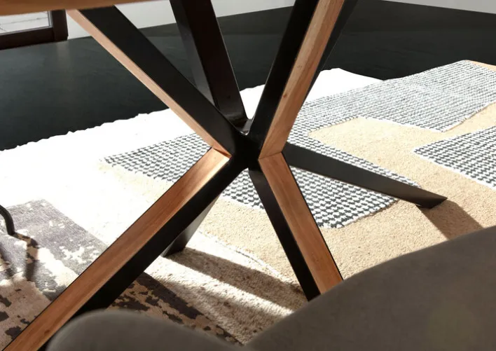 Das Design des Tisches bestimmt auch das schwarz-braune Spinngestell. Der rechteckige Esstisch TAREK hat eine Höhe von 76 cm. Unter dem Möbelstück haben entsprechende Stühle Platz. Mindestens sechs Personen können es sich gemeinsam um den Esstisch gemütlich machen. Das Produkt kommt für den Innenbereich infrage. Es ergänzt hier vor allem den Ess- und Wohnbereich und lädt zum Verweilen ein. Die gebeizt und lackierte Tischplatte hat eine Plattenstärke von 26 cm. Ihr Design ist durch eine Schweizer Kante geprägt.