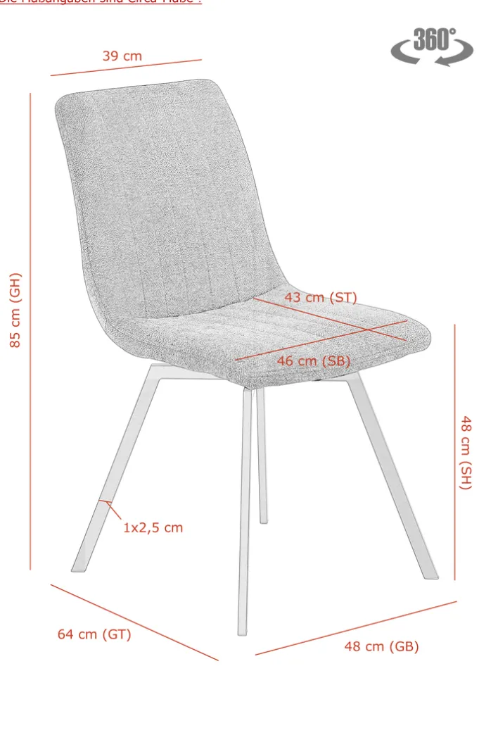 Eine Besonderheit der Stühle: die um 360° drehbare Sitzfläche. Das Set beinhaltet zwei Esszimmerstühle mit den gleichen Abmessungen.
