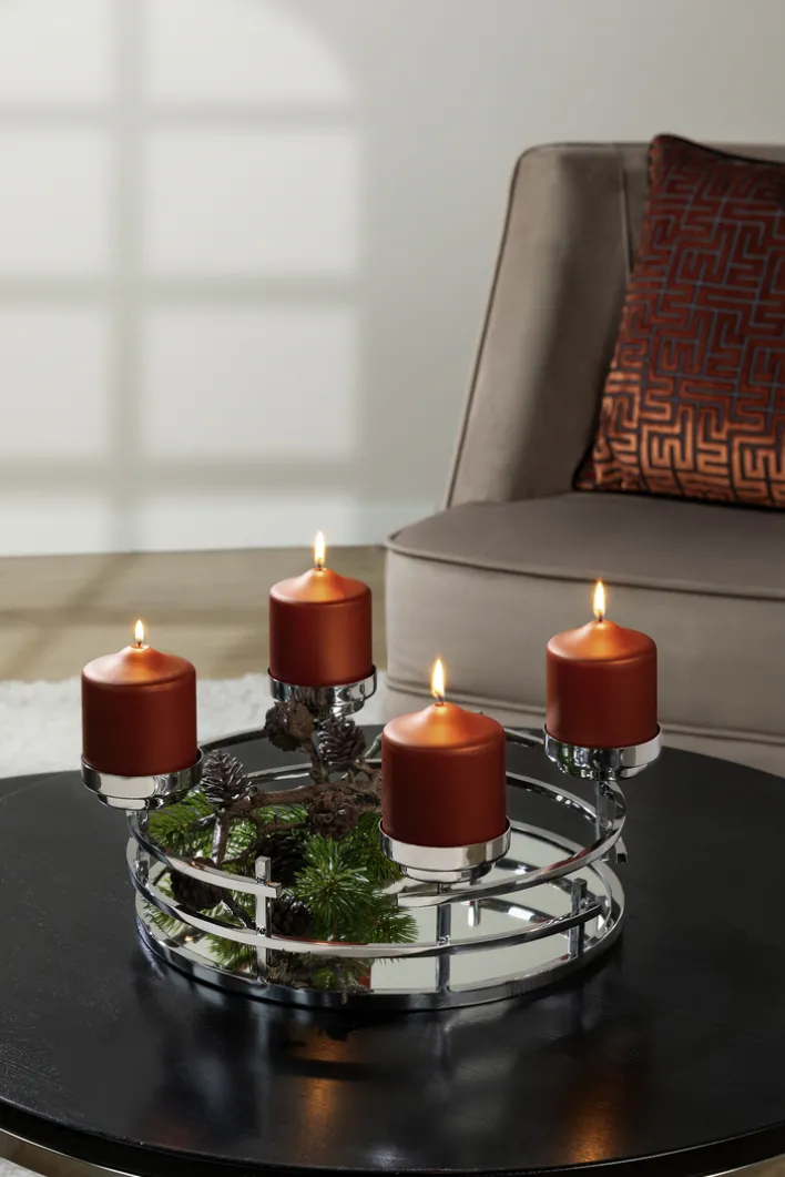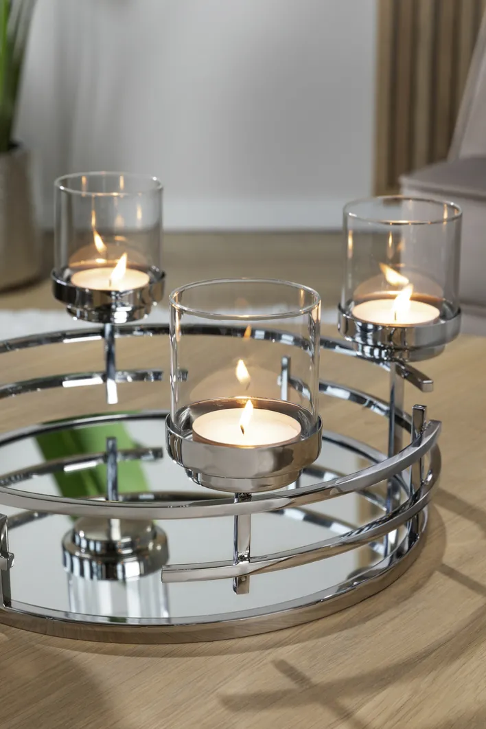 Die runde Form des Kerzenständers harmoniert perfekt mit seiner klaren Linienführung und den transparenten Glaselementen, die das Licht der Kerzen stilvoll reflektieren. Der Kerzenhalter ist nicht nur ein funktionales Accessoire, sondern auch ein dekoratives Highlight für jeden Wohnraum. Mit einem Gewicht von 2,97 kg steht er stabil und sicher auf jeder Oberfläche.