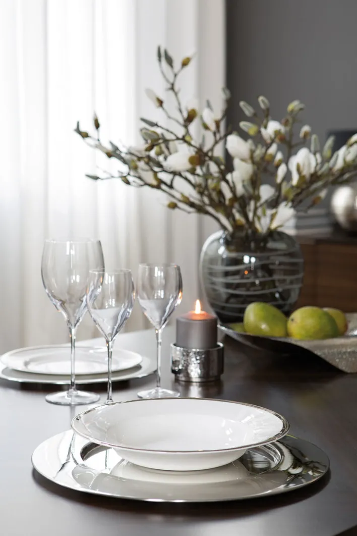 Der Platzteller CAMPO in Silberfarbig hat einen Durchmesser von 33 cm und ist ein Produkt aus dem Hause Fink. Er dient als Unterlage für einen tiefen Teller, in welchem beispielsweise Suppen oder Eintöpfe serviert werden können und zeichnet sich durch seine elegante Verarbeitung aus. Besonders attraktiv ist der brillante Glanz, in welchem sich Kerzenlicht stimmungsvoll spiegelt. Ideal, um dem Wohnzimmer oder Esszimmer eine edle Note zu verleihen.