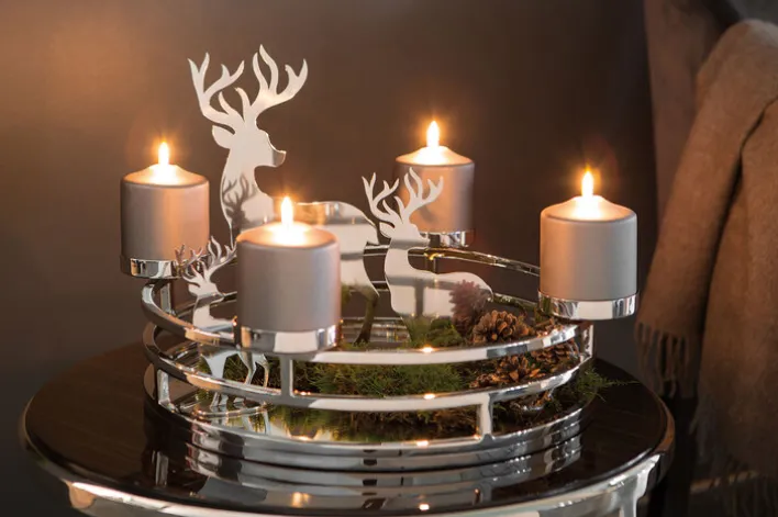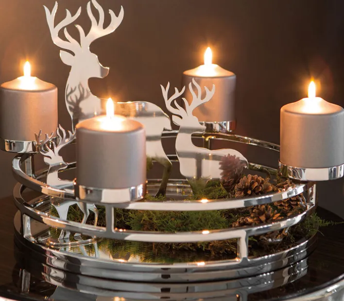 In stilvoller Eleganz präsentiert sich dieses silberfarbige Tablett mit Kerzenhalter MODENA. Vier Kerzen finden in der runden Halterung Platz, den Boden bildet ein ebenfalls silberfarbiges Tablett aus Metall. Den Hingucker dieses außergewöhnlichen Accessoires aus dem Hause Fink. Dieser edle Kerzenhalter MODENA lässt Ihnen reichlich Freiraum in der Gestaltung. Er sieht ohne Dekoration bezaubernd aus. In der Weihnachtszeit wird aus dem silberfarbigen Leuchter ein stimmungsvoller Adventskranz. Mit der entsprechenden Ausschmückung bietet der Kerzenhalter vor allem Tierfreunden auch in anderen Jahreszeiten viel Vergnügen.