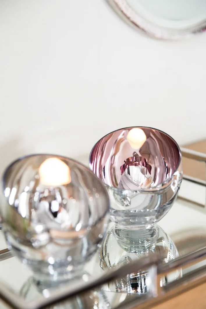 Kühl glänzende Silbertöne kombiniert mit einer warm flackernden Flamme. Der Teelichthalter CANDY zaubert eine behagliche Atmosphäre in jeden Raum. Die glänzende Oberfläche im Inneren des 11 cm hohen Gefäßes aus Glas sorgt für hübsche Lichteffekte, die besonders bei einsetzender Dunkelheit gut zur Geltung kommen.
