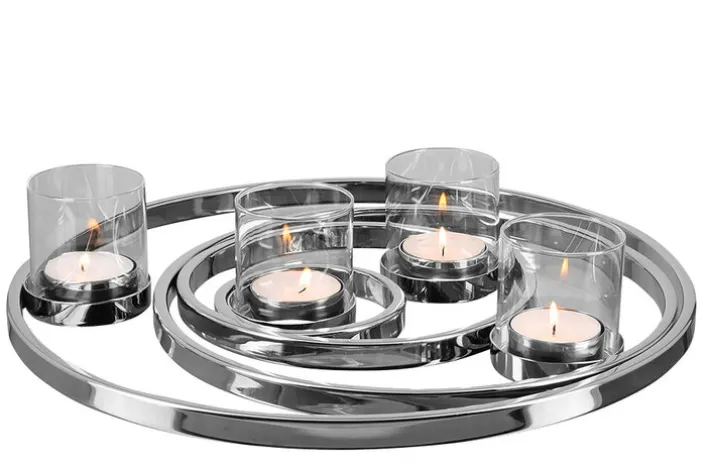 Mit dem 42 cm großen Fink Teelichthalter Kranz UNIVERSE kommt ein eleganter Blickfang auf den Wohnzimmertisch, der nicht nur in der Weihnachtszeit eine tolle Figur macht. Der Fink Teelichthalter Kranz UNIVERSE kombiniert den Teelichthalter-Kranz aus vernickeltem, hochglänzendem Edelstahl mit vier transparenten Aufsätzen aus Rauchglas. In den Glasaufsätzen ist Platz für vier Teelichter und diese sind zuverlässig vor Zugluft geschützt. Der Teelichthalter Kranz ist ein eleganter Ersatz für einen traditionellen Adventskranz, der viele Jahre gute Dienste leistet. Doch nicht nur im Advent, auch den Rest des Jahres ist der edle Teelichthalter in Kranzform eine ansprechende Dekoration, die mit romantischem Kerzenlicht bezaubert.