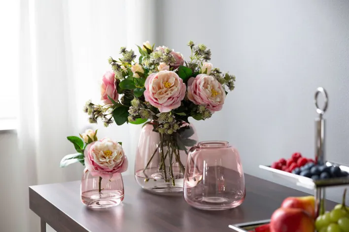 Die 15,5 cm hohe Fink Vase SUNDAY bringt frischen Glanz und frühlingshafte Leichtigkeit in ein geschmackvoll eingerichtetes Zuhause. In dem ganz in transparentem Rosé gehaltenen Gefäß lassen sich Schnittblumen in verschiedenen Pink-Tönen besonders effektiv arrangieren. Kombiniert mit leuchtendem Grün und etwas frischem Weiß ein optischer Genuss, der den ganzen Raum zum Strahlen bringt.