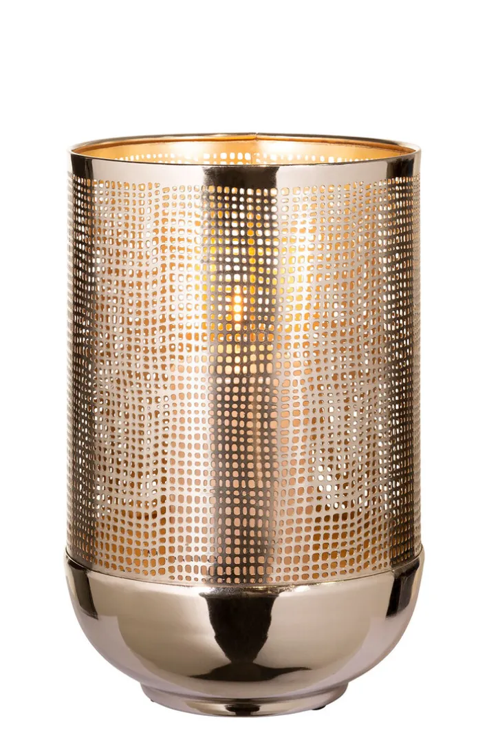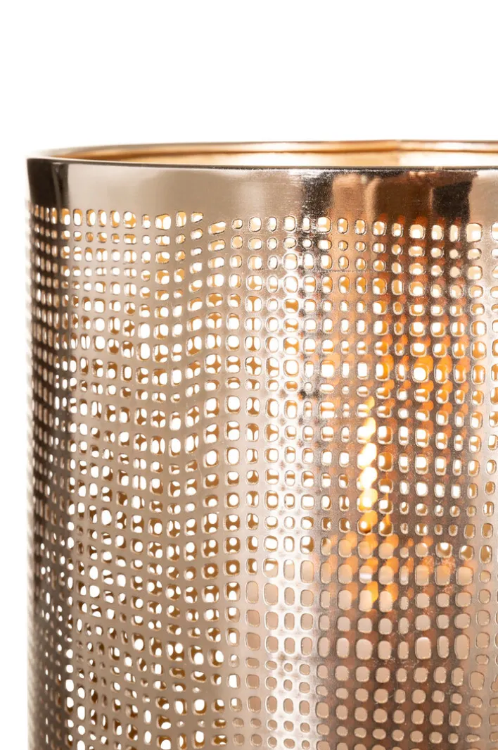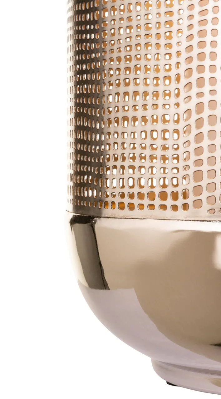 Das moderne Fink Windlicht MAURA vereint Glas und Metall. Mit der vernickelten Oberfläche, die außen in Silberfarbig gehalten ist, ist das Windlicht vielseitig kombinierbar. Die Innenseite erstrahlt in Goldfarbig, wodurch das Kerzenlicht besonders warm strahlt. Durch das schöne Lochmuster zaubert die Kerze spannende Lichtspiele an die Wände. Das edle Windlicht ist für Stumpenkerzen und Teelichter gleichermaßen geeignet und sieht auch auf der Terrasse wunderschön aus.
