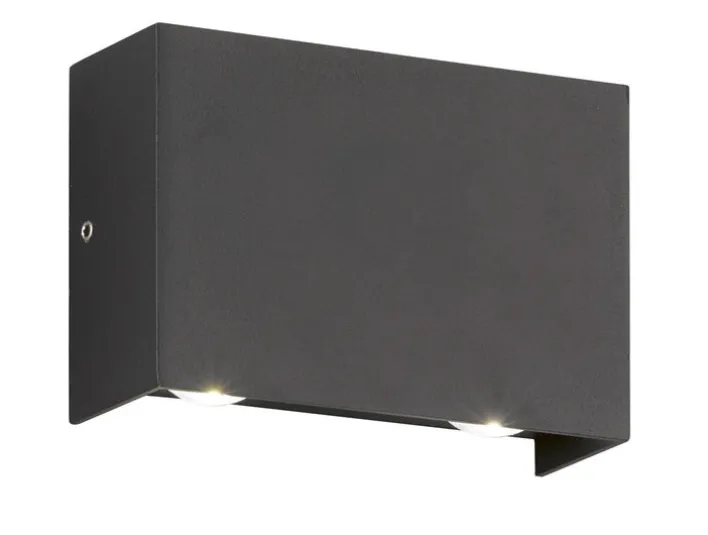 Die 10 Watt starke FISCHER & HONSEL LED Außenwandleuchte NAIROBI hat eine Bautiefe von 5 cm. Sie kann an der Hauswand im Eingangsbereich oder neben einer Garageneinfahrt installiert werden. Jeweils 2 LEDs strahlen die Fassade nach oben und unten an. Das erfolgt in Warmweiß und mit einer Lichtstärke von 4 × 240 Lumen. Dieses Modell entspricht der Schutzklasse 2 (IP54) und ist vor allseitigem Spritzwasser geschützt. Die Up and Down Lampe kommt mit fest eingebautem Leuchtmittel. Bis zu 20.000 Stunden Brenndauer sind möglich.