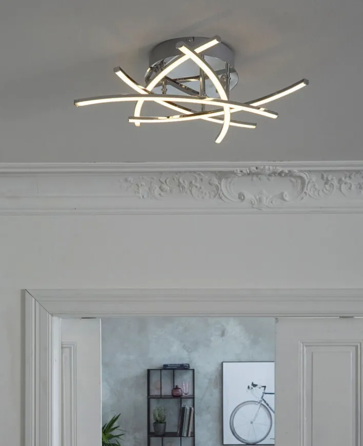 Die FISCHER & HONSEL LED Deckenlampe CROSS besteht aus chromfarbigen Metall und besitzt 5 Lichtquellen. Die Farbe Chrom eignet sich für alle Räume. Weiterhin ist die Deckenleuchte dimmbar und per Fernbedienung zu steuern. Fünf raffiniert angeordnete, ineinandergreifende Arme sorgen für die richtige Beleuchtung. Sie sind lang und schlank und ergeben zusammen fast ein Rund. Ihre zarte Eleganz überzeugt und auch der metallische Baldachin, der an der Decke befestigt wird, passt harmonisch dazu.