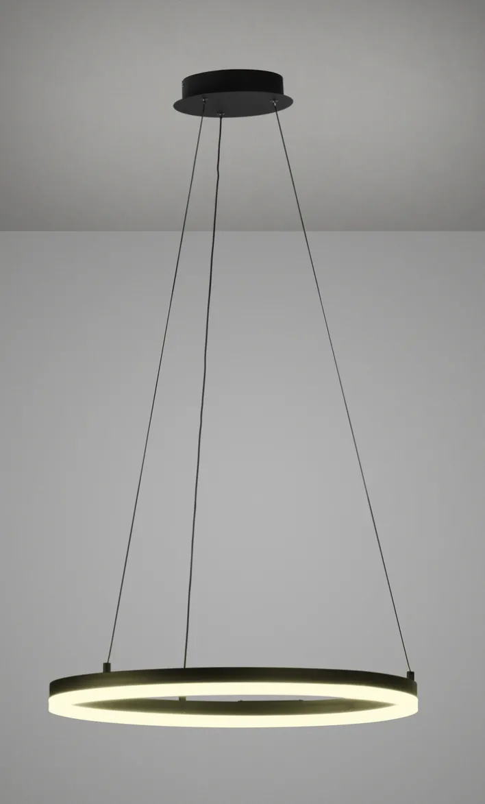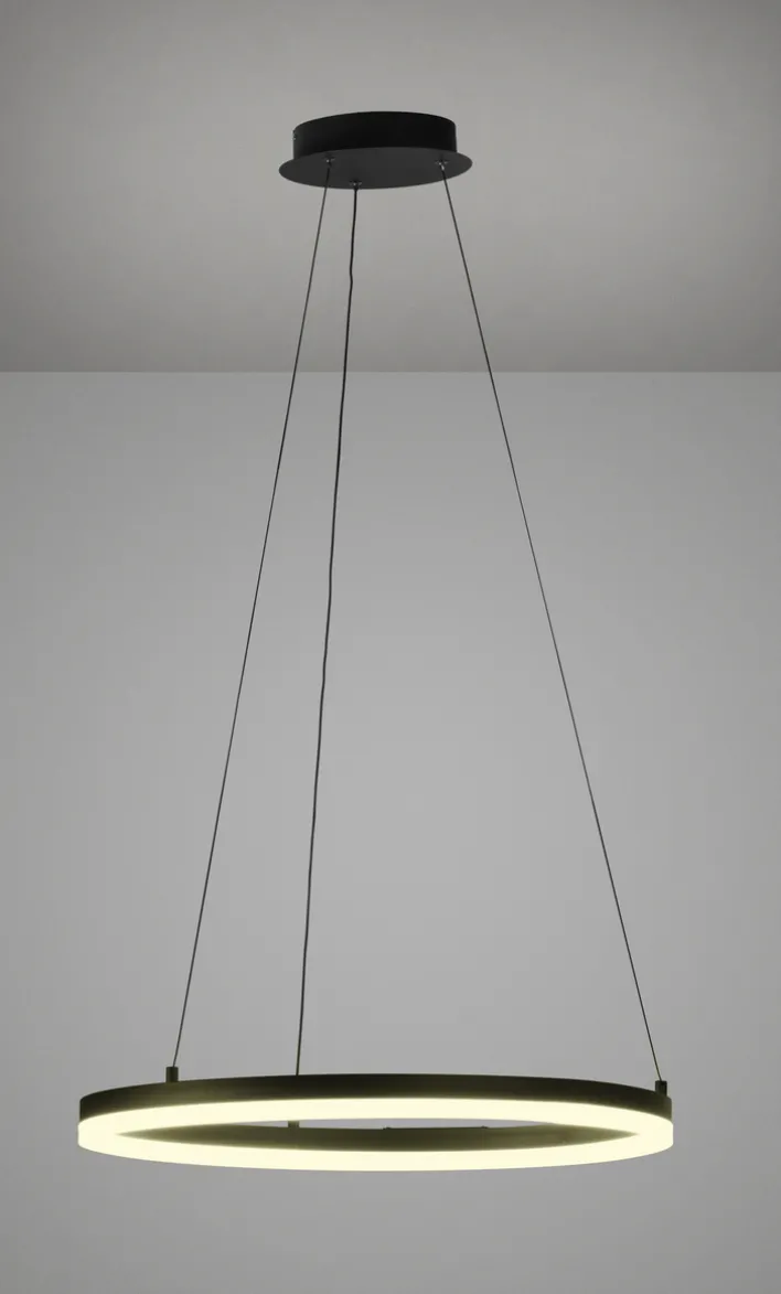Die FISCHER & HONSEL LED Pendelleuchte SIRKO hat einen Durchmesser von 60 cm und eine einstellbare Höhe von 50 bis 150 cm. Sie ist aus Metall in Sandschwarz und weißem Glas.
