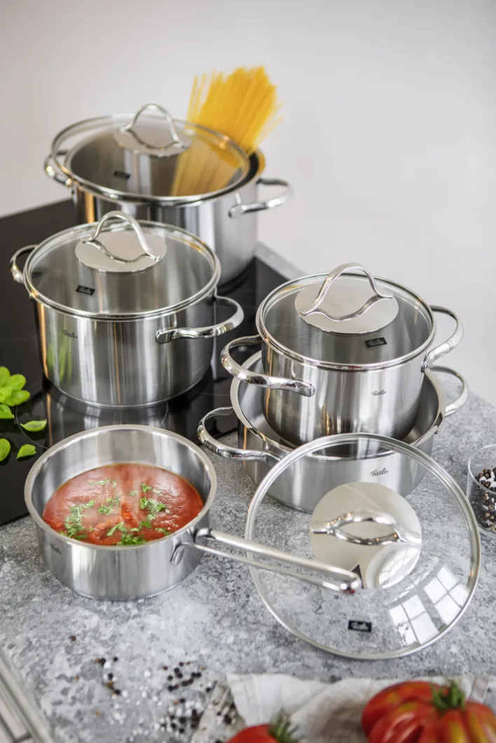 Das Fissler Topfset aus hochwertigem Edelstahl bietet eine langlebige und rostfreie Lösung für Ihre Küche. Das Set besteht aus fünf Teilen: drei Kochtöpfe mit Durchmessern von 16 cm, 20 cm und 24 cm, ein Bratentopf mit 20 cm Durchmesser und ein Stieltopf ebenfalls mit 20 cm Durchmesser. Alle Töpfe sind für alle Herdarten geeignet, was ihre Vielseitigkeit unterstreicht.