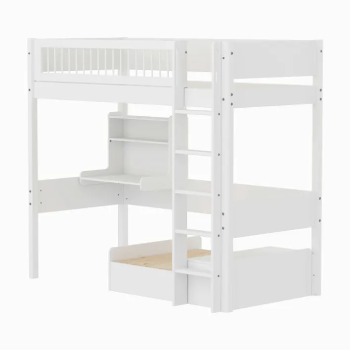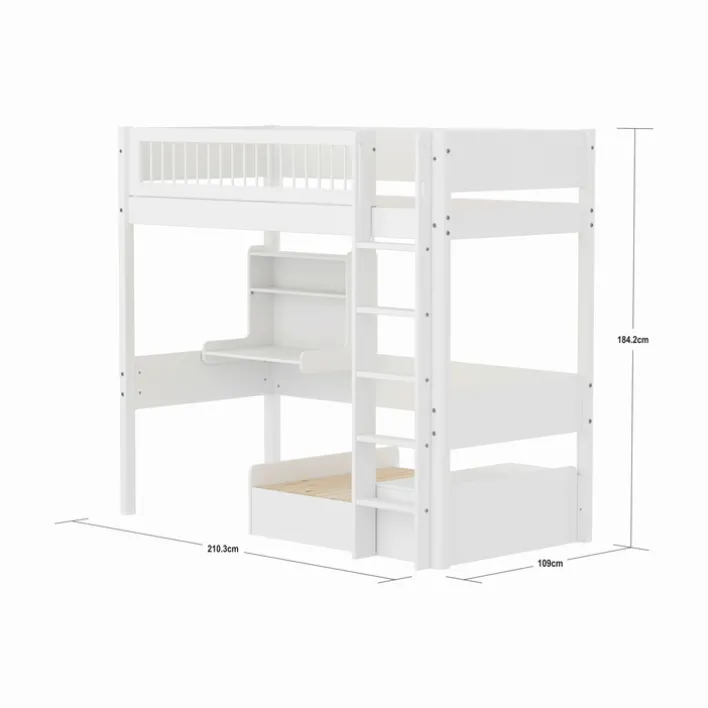 Das Hochbett aus der Serie „White“ von Flexa bietet eine praktische und stilvolle Lösung für moderne Wohnräume. Mit einer Breite von 109 cm, einer Höhe von 184 cm und einer Länge von 210 cm passt es perfekt in viele Kinderzimmer. Die Liegefläche von 90 x 200 cm ist ideal für Kinder und Jugendliche geeignet. Das Bett ist aus teilmassivem Kiefernholz gefertigt und mit einer weißen Lackierung versehen, die eine helle und freundliche Atmosphäre schafft.