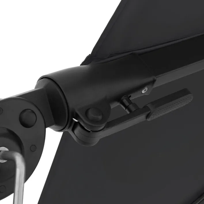 grau-schwarzem pulverbeschichtetem Aluminium und der Schirm aus witterungsbeständigem Polyester.
