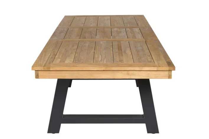 Der große Gartentisch OLI von Garden FLAIR hat die Maße 220 x 100 cm und präsentiert sich elegant in einem zeitlosen Design. Durch die wunderschöne Tischplatte aus Teak und das A-Gestell im Farbton Sandschwarz fällt der rechteckige Tisch sofort ins Auge und ist leicht mit verschiedenen Gartenstühlen kombinierbar. Ausgestattet mit einem Auszug, ist der Tisch auf 300 cm verlängerbar und bietet Platz für 8 bis 10 Personen. Der schöne Gartentisch für den Innen- und Außenbereich schafft auf der Terrasse oder im Garten eine angenehme Atmosphäre.