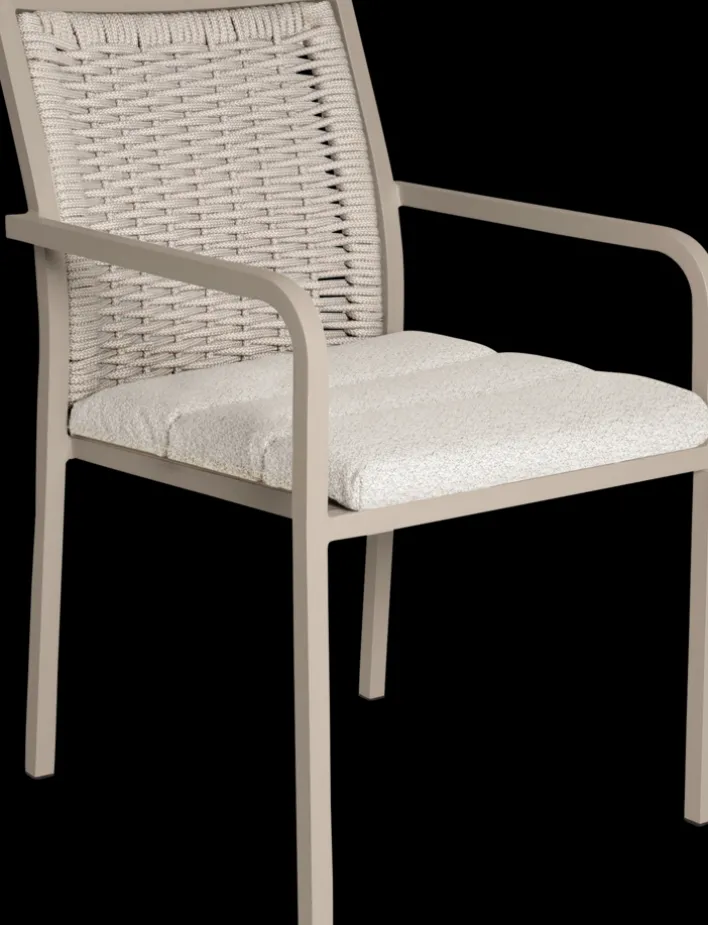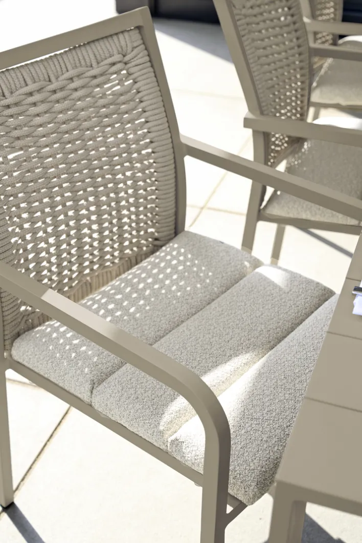 Der Stapelstuhl Garten ROEN zaubert einen Hauch von Exklusivität in den Außenbereich. Dazu tragen cremige Farbtöne, aber auch ein ausdrucksstarkes Japandi-Design bei. Seine Geflechtoptik aus wasserabweisenden Outdoormaterialien gibt ihm eine angenehme Leichtigkeit. Das pulverbeschichtete Gestell aus Aluminium steht für Hochwertigkeit und die Sitzpolster mit Olefin-Oberfläche sorgen für bequemen Sitzkomfort. Zudem ist der Armlehnstuhl für Draußen stapelbar und kann dadurch platzsparend untergebracht werden.