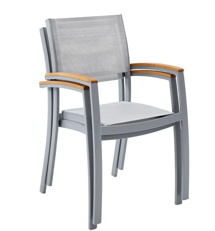 Der Garden FLAIR Stapelstuhl Garten SALZBURG besteht aus Aluminium und einem textilen Outdoorgewebe in hellgrau. Er besitzt zwei Armlehnen und ist äußerst platzsparend, da stapelbar.